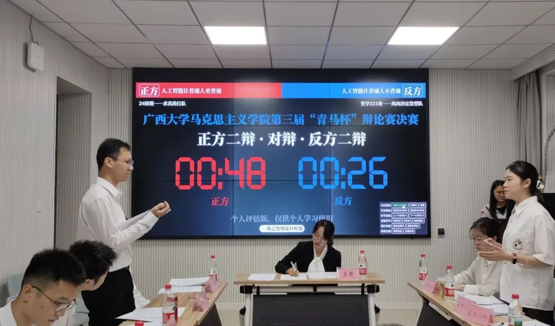 5月21日,我院第三届“青马杯”辩论赛决赛正式打响。哲学221班辩论队与研究生24级1班辩论队围绕“人工智能让普通人更普通/不普通”的辩题展开了激烈交锋,为在场师生带来了一场视听与思辨盛宴。外国语学院团委书记陈星宇、土木建筑工程学院辅导员颜显能、农学院辩论队前队长赵菡同学担任决赛评委,并围绕“如何打好一场辩论赛”的主题进行了经验分享与技术指导。