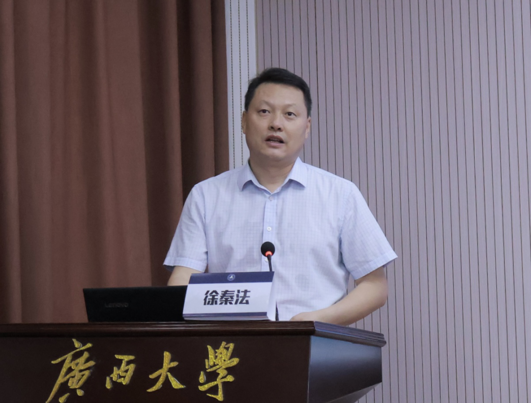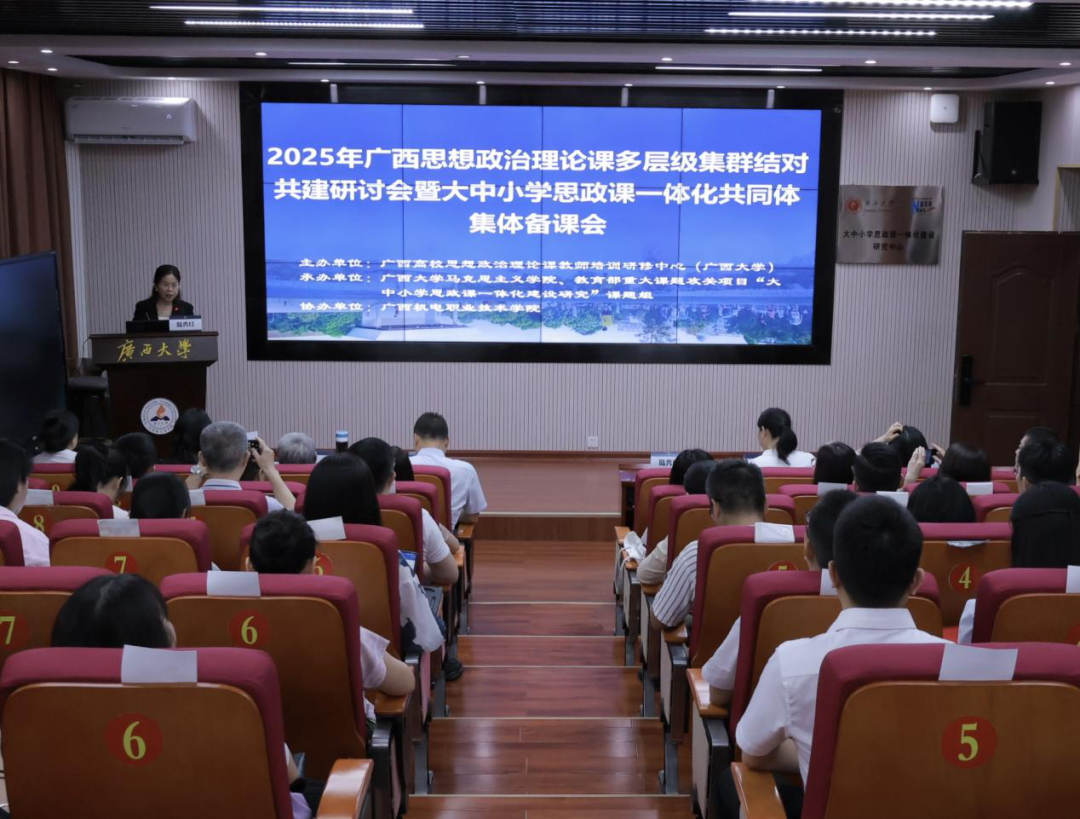 为推进我区大中小学思政课一体化高质量发展,助力各结对共建高校更好地参与“第四届全国高校思想政治理论课教学展示活动”,7月5日,由广西高校思想政治理论课教师培训研修中心(广西大学)主办,教育部重大课题攻关项目“大中小学思政课一体化建设研究”课题组承办的2025年广西思想政治理论课多层级集群结对共建研讨会暨大中小学思政课一体化共同体集体备课会在我院举行。广西大学校长助理、马克思主义学院院长徐秦法出席开幕仪式并致辞,马克思主义学院副院长陆秀红主持开幕仪式。